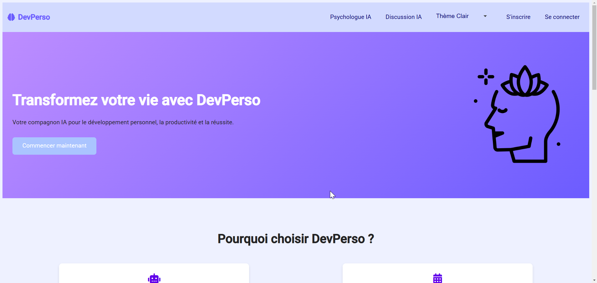 Projet personnel que j’ai conçu pour l’épanouissement individuel avec outils pratiques. Propose un chatbot et une IA orientée psychologie pour accompagner gratuitement les utilisateurs, fixer leurs objectifs et les suivre comme un véritable psychologue.